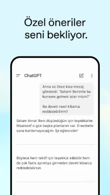 ChatGPT ile yapay zekanın gücünü keşfedin. Merak ettiğiniz her konuda anında yanıtlar alın, yaratıcı fikirler üretin ve karmaşık problemleri çözün. Kişisel asistanınız her zaman yanınızda.